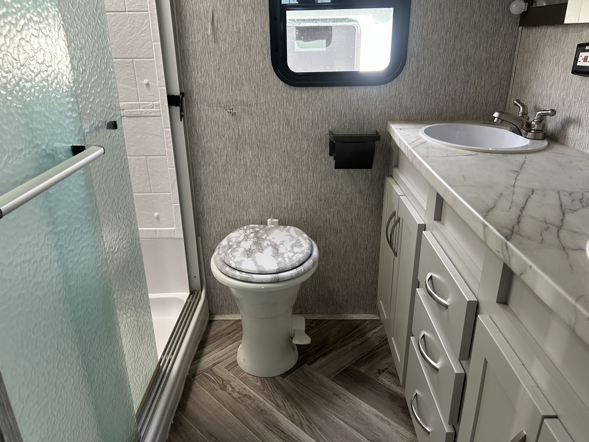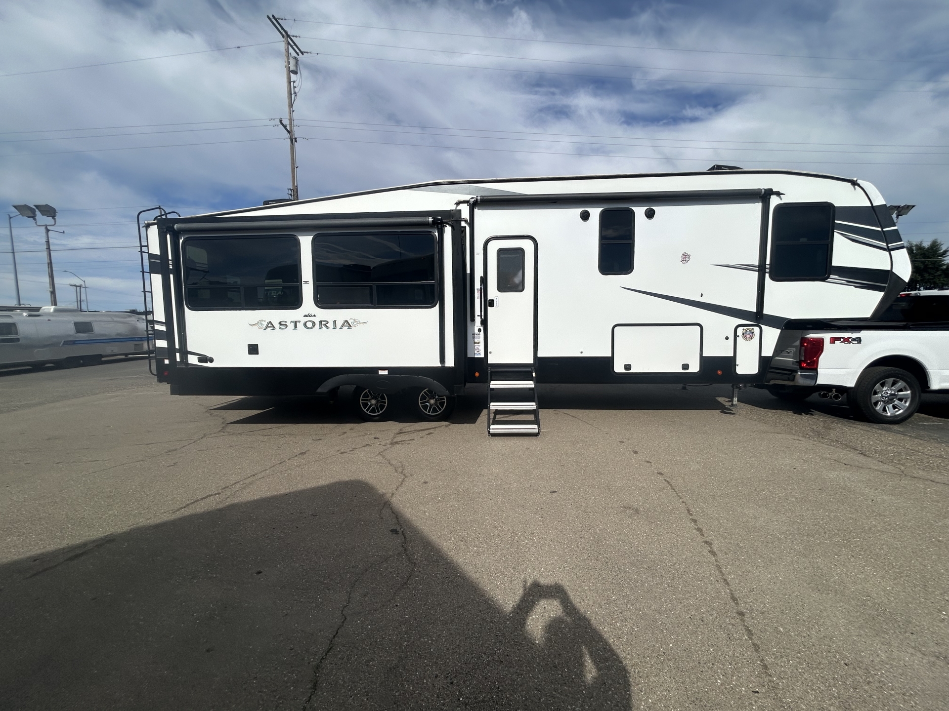 2021 Dutchman Astoria Platinum 3173RLP 5th Wheel Trailer, 35', 3 slides, 2 power awnings with led lighting, sleeps 4, roof a/c and heat, electric auto leveling system, electric fireplace, front king sized master bedroom slide with dresser, washer and dryer hookups, tv, and large closet, large jack and jill private bathroom, center island, kitchen pantry, theater seats, rear sofa sleeper, free standing dinette,lots of storage and cabinet space including a pass through outer storage compartment. Very clean, open spacious floor plan.