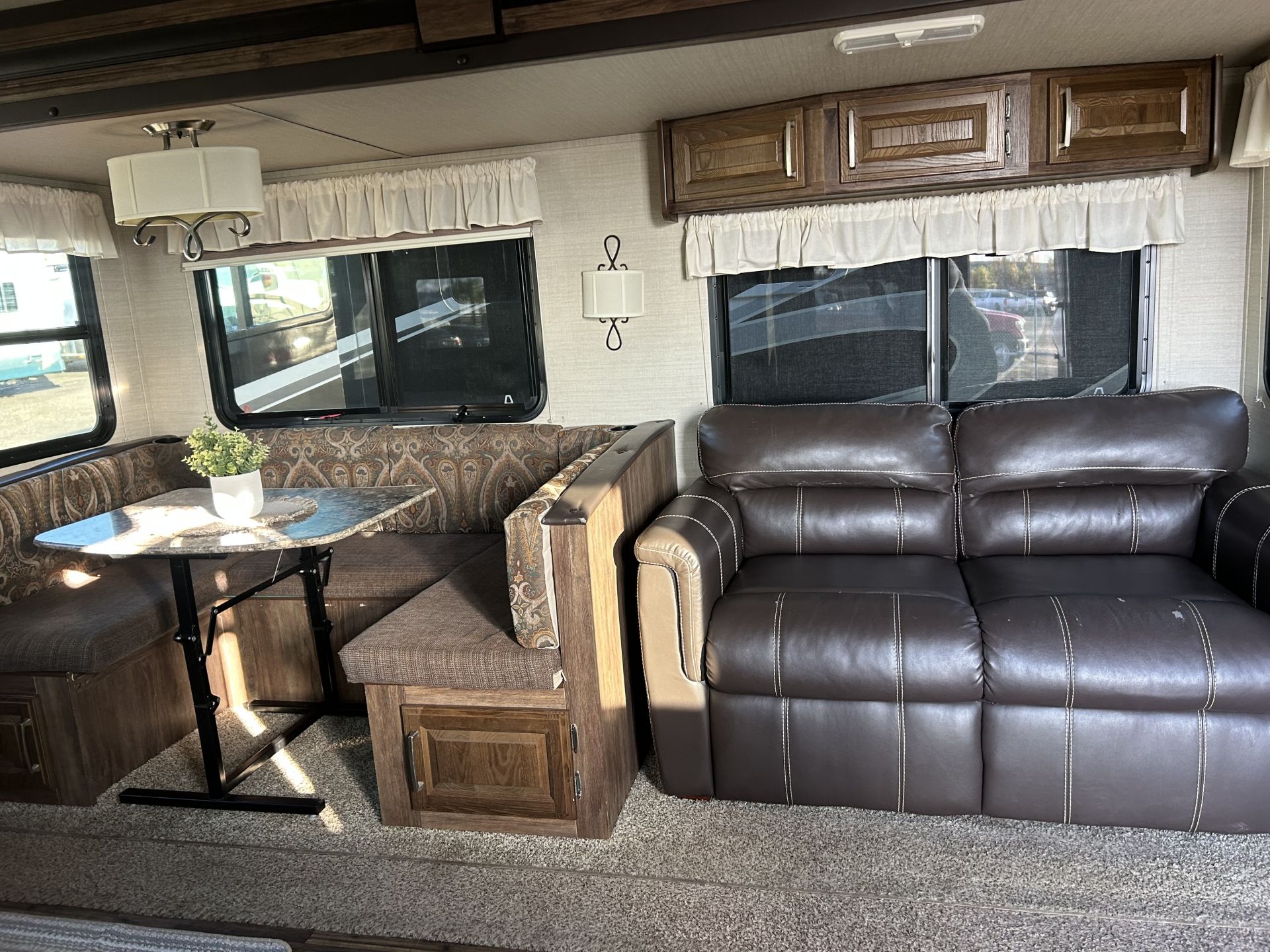 2016 Keystone Cougar 279RKSWE Fifth Wheel Trailer, 27', 1/2 ton towable, lightweight with a base weight of 7136 lbs, fully self contained, 2 slides, power awning, full power automatic landing gear, sleeps 6, rear kitchen with large fridge, oven/stove, microwave, horseshoe dinette, sleeper sofa, entertainment center with flat screen tv, master queen front bedroom with full pass thru bathroom, extended rear bumper,roof a/c, central heat, lots of storage and cabinet space including front pass through storage, very clean inside and out.