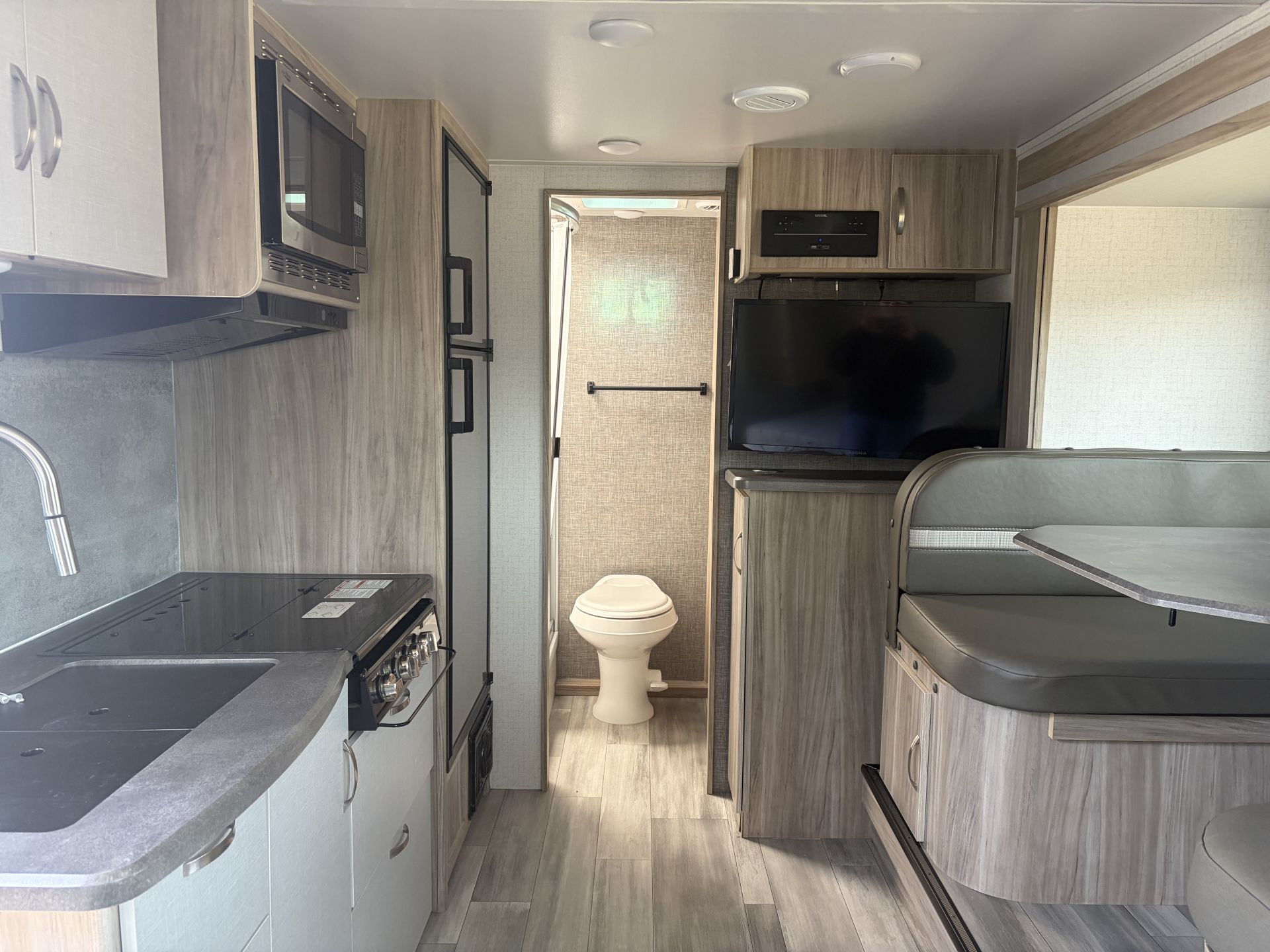 2022 Winnebago Micro Minnie 2108 FBS Travel Trailer, 22' 5", half ton towable with a base weight of 3900 lbs, tandem axle, mud/snow tires, one slide, awning, sleeps 4, solar, tv, a/c, stove, microwave, fridge, convertible dinette, outdoor shower.
